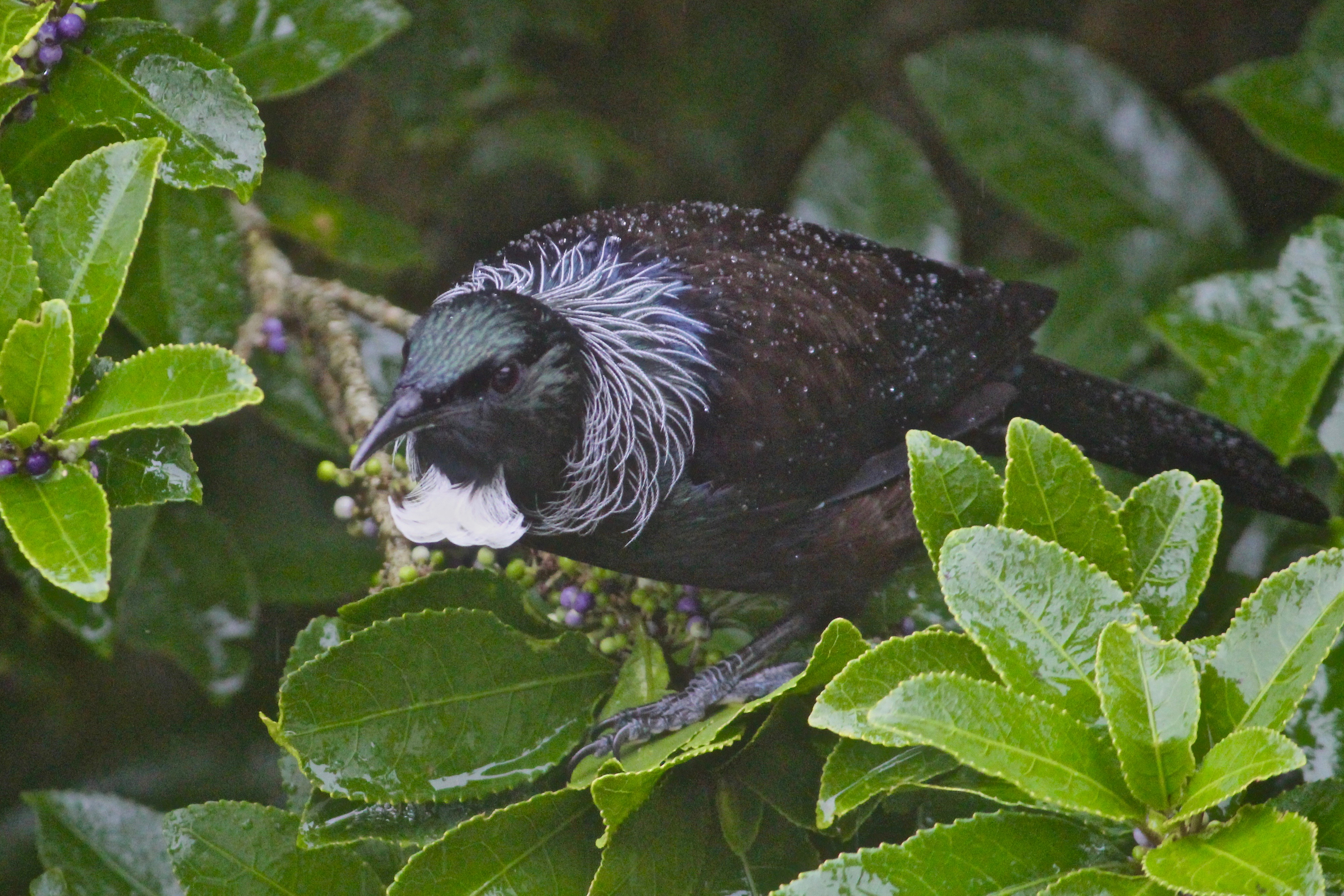 a Tui in the rain
